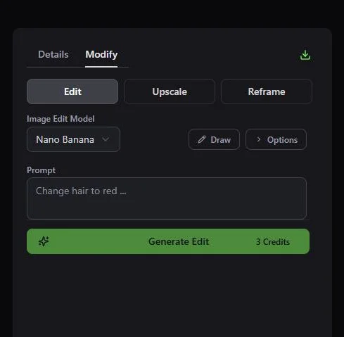 Editing Actor Images: To make edits to an existing Actor Image, click on the Edit button under the image. This will open a menu that will let you generate a similar image with a change to it, such as changing the Actor’s hair color or clothing.