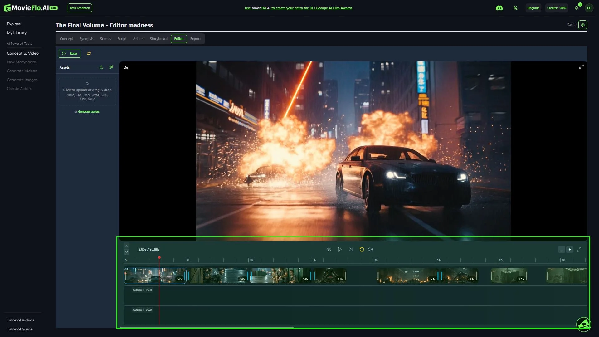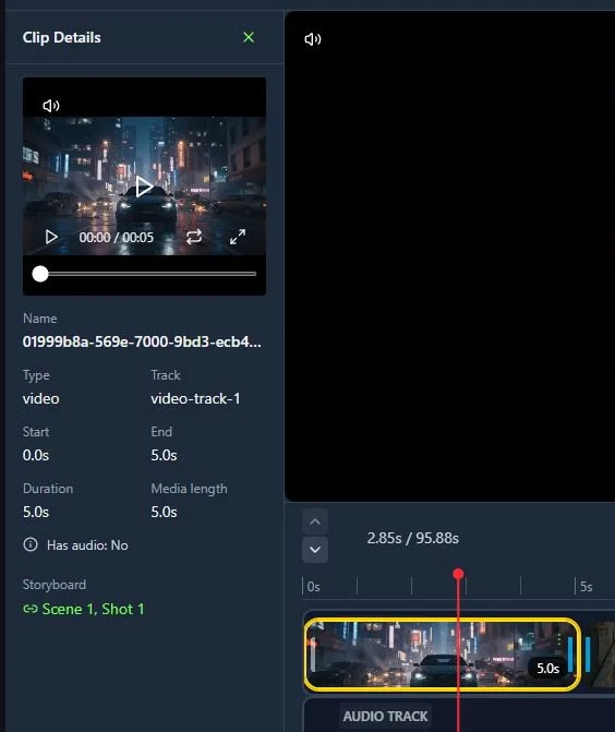 In the Editor, your story is automatically assembled into a longer sequence. You can trim these clips, add and time audio (your own uploads or Text-to-Speech), and then export the final movie. V1 focuses on assembling these AI-generated segments and exporting them to an established video editor.