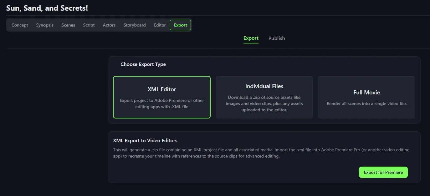 Choose Export Type - We currently offer three different options for exporting: XML Editor, Individual Files and Full Movie.