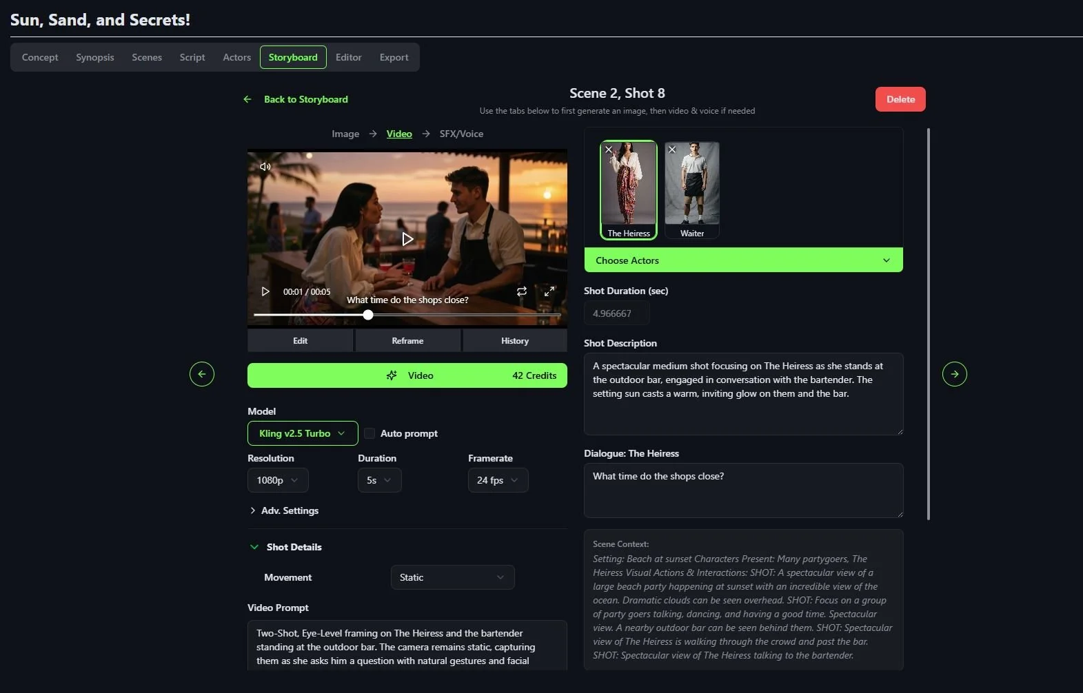 Iterative Process: You can always go back to previous steps (Concept, Script, Actors, Storyboards, Video Clips) to make changes and regenerate elements. Your project saves automatically. It is important to keep in-mind however, if you make changes, you may need to regenerate the steps after this. For example, if you edit your actors, you would then need to regenerate the prompts and then images with the old actors.