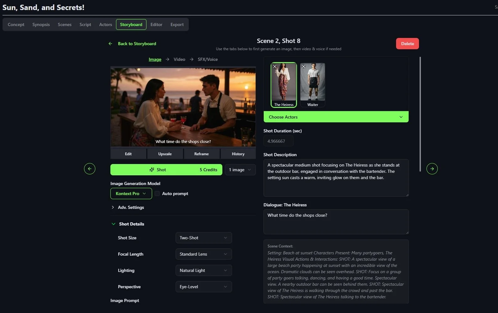 Dialogue: If the script calls for any dialogue, it is listed here. It should be automatically associated with the character that is speaking. You can alter this dialogue, as desired. You can also remove or add dialogue to shots.